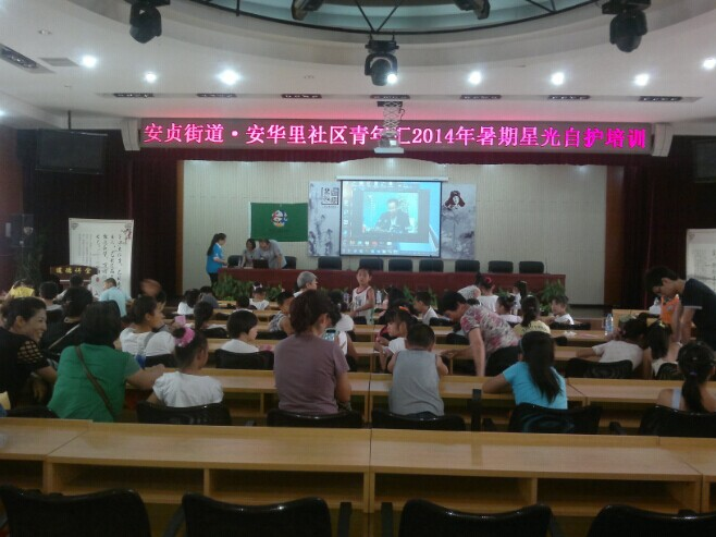 本次活动的主要内容为“安贞街道•安华里社区青年汇2014年暑期星光自护培训”志愿服务活动,为使此次培训会得以顺利开展,我校志愿者协助安华里社区志愿者开展相关工作。志愿者们分工明确,摆放桌椅,引导参会的家长及儿童就坐,悬挂旗帜,组织签到等,每一名志愿者都在自己的岗位上认真工作着。由于参会人数远远超过预期人数导致椅子数量不够,志愿者们又及时协助社区工作人员搬来座椅保证每一位参会人员都有座位。培训会开展期间,志愿者们积极协助维持现场秩序。参会的小朋友们积极配合老师进行情景演练,赢得了大家的赞赏。本次的自护培训在阵阵掌声中落下了帷幕。