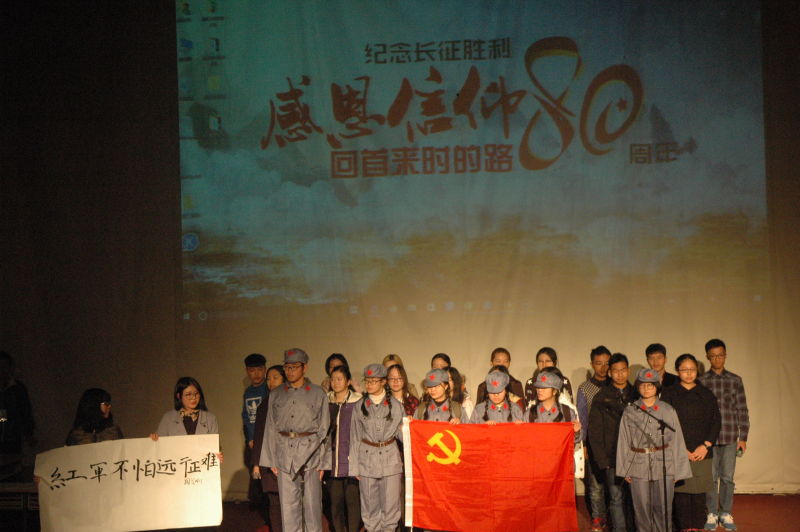 晚会在四位主持人的介绍中拉开了序幕。晚会前期由各班班委组织学习长征精神,采用听老兵讲故事、长征精神学习主题班会、参观革命军事博物馆等形式深入领会长征精神;晚会上各班以长征精神为依托,以PPT形式展示学习成果,并表演文艺节目,表演完毕后由评委打分。晚会文艺表演主题鲜明,紧扣“感恩信仰 回首来时的路”,表演形式多样:舞台剧生动,改编课本剧有趣,历史穿越剧新颖不失庄重;歌声悠扬,舞姿优美,朗诵深情不失铿锵。各班同学的呼唤声声入耳、表演处处有情,将我们的思绪带回那段峥嵘岁月,再现了红军战士当年克服困难、勇往直前的那份坚毅,面对敌寇不怕牺牲、团结一致的那身傲骨,秉持信仰、前赴后继的那份义无反顾,他们百折不挠,他们众志成城!同学们的倾情演出,激发了广大师生的爱国热情,台下响起热烈的掌声。晚会还穿插了抽奖活动,点燃了观众的热情;流火话剧团受邀,为我们表演了一出感人至深的话剧。最后,主持人公布本场晚会获奖情况,评委为获奖班级颁发证书并合影留念,刘传宇老师上台发言,从“感谢”、“感动”、“感恩”三个方面对本次晚会进行点评,并强调了感恩信仰、铭记长征的重要性。