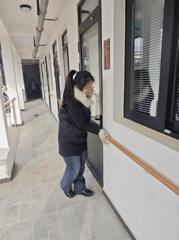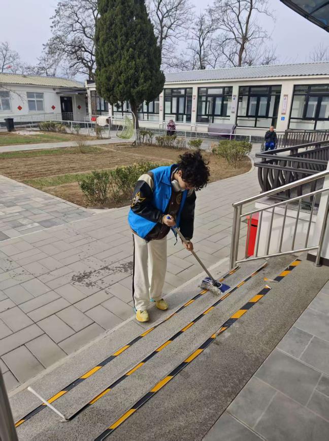 志愿者们分工明确、默契配合,拿起抹布仔细擦拭栏杆、门窗,不放过每一处灰尘;弯腰清扫庭院台阶、角落杂物,将公共区域打理得干干净净。大家不怕脏、不怕累,用双手一点点整理出整洁舒适的环境,让老人们的生活空间焕然一新,每一处干净的角落,都藏着志愿者们细致的心意。